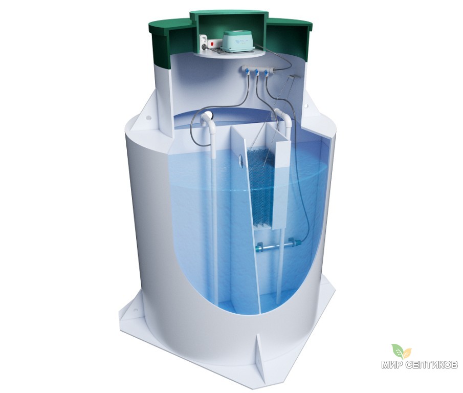 Технология очищения обусловлена особенностями конструкции оборудования, под корпусом которого располагается внутренняя очистительная станция с четырьмя отсеками. Каждый из них играет свою роль в удалении загрязнений из жидкости.В первичной камере, куда стоки поступают через входное отверстие, происходит их механическая очистка и забор крупнофракционных элементов. Далее жидкость перетекает в блок биологической загрузки, в котором находятся аэробные микроорганизмы, поглощающие кислород наряду с органическими и химическими элементами. Здесь происходит очистка воды от бактерий и неприятного запаха.